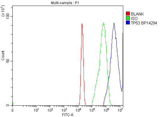 Overlay histogram showing A431 cells stained with A00001-2 (Blue line). To facilitate intracellular staining, cells were fixed with 4% paraformaldehyde and permeabilized with permeabilization buffer. The cells were blocked with 10% normal goat serum. And then incubated with rabbit anti-P53/TP53 Antibody (A00001-2) at 1:100 dilution for 30 min at 20°C. DyLight®488 conjugated goat anti-rabbit IgG (BA1127) was used as secondary antibody at 1:100 dilution for 30 minutes at 20°C. Isotype control antibody (Green line) was rabbit IgG at 1:100 dilution used under the same conditions. Unlabelled sample without incubation with primary antibody and secondary antibody (Red line) was used as a blank control.