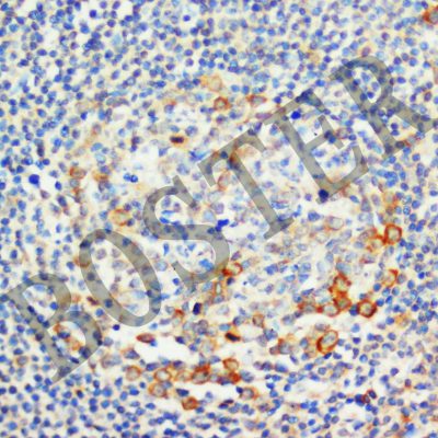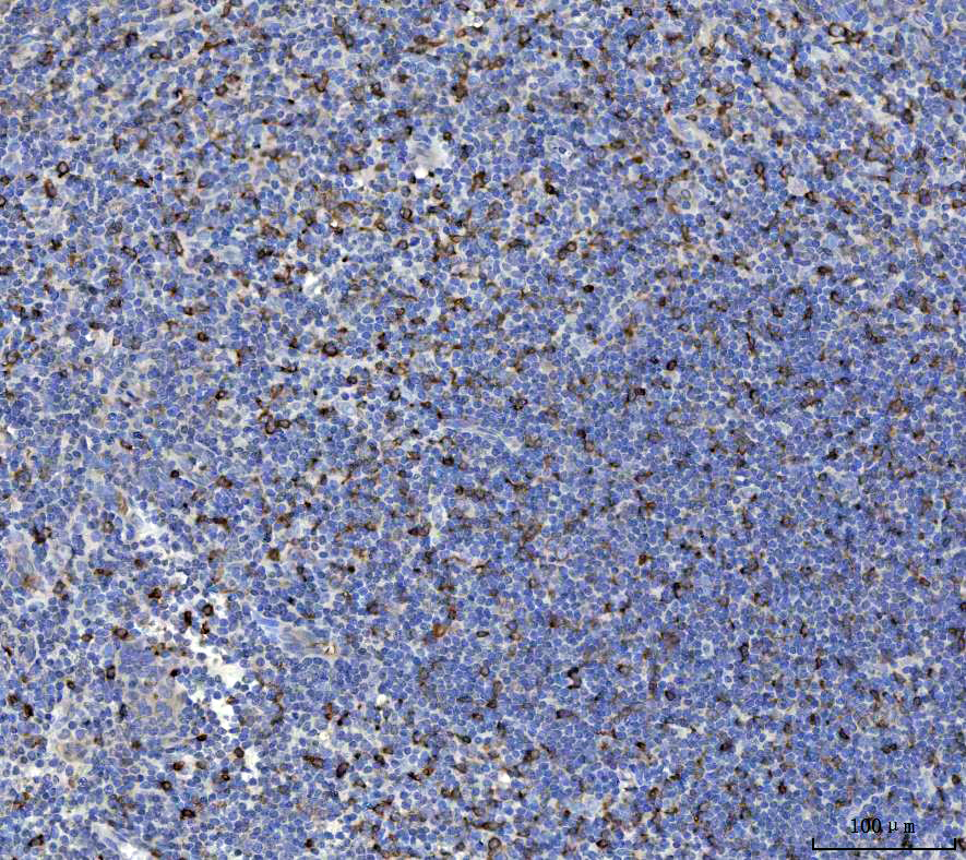 IL10 was detected in a paraffin-embedded section of rat spleen tissue. The tissue section was incubated with rabbit anti-IL10 Antibody (A00021-3) at a dilution of 1:200 and developed using HRP Conjugated Rabbit IgG Super Vision Assay Kit (Catalog # SV0002) with DAB (Catalog # AR1027) as the chromogen.