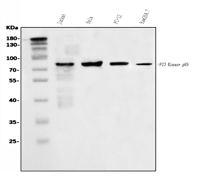 Western blot analysis of PI3K p85 alpha/PIK3R1 using anti-PI3K p85 alpha/PIK3R1 antibody (A00318-1). The sample well of each lane was loaded with 30 ug of sample under reducing conditions.