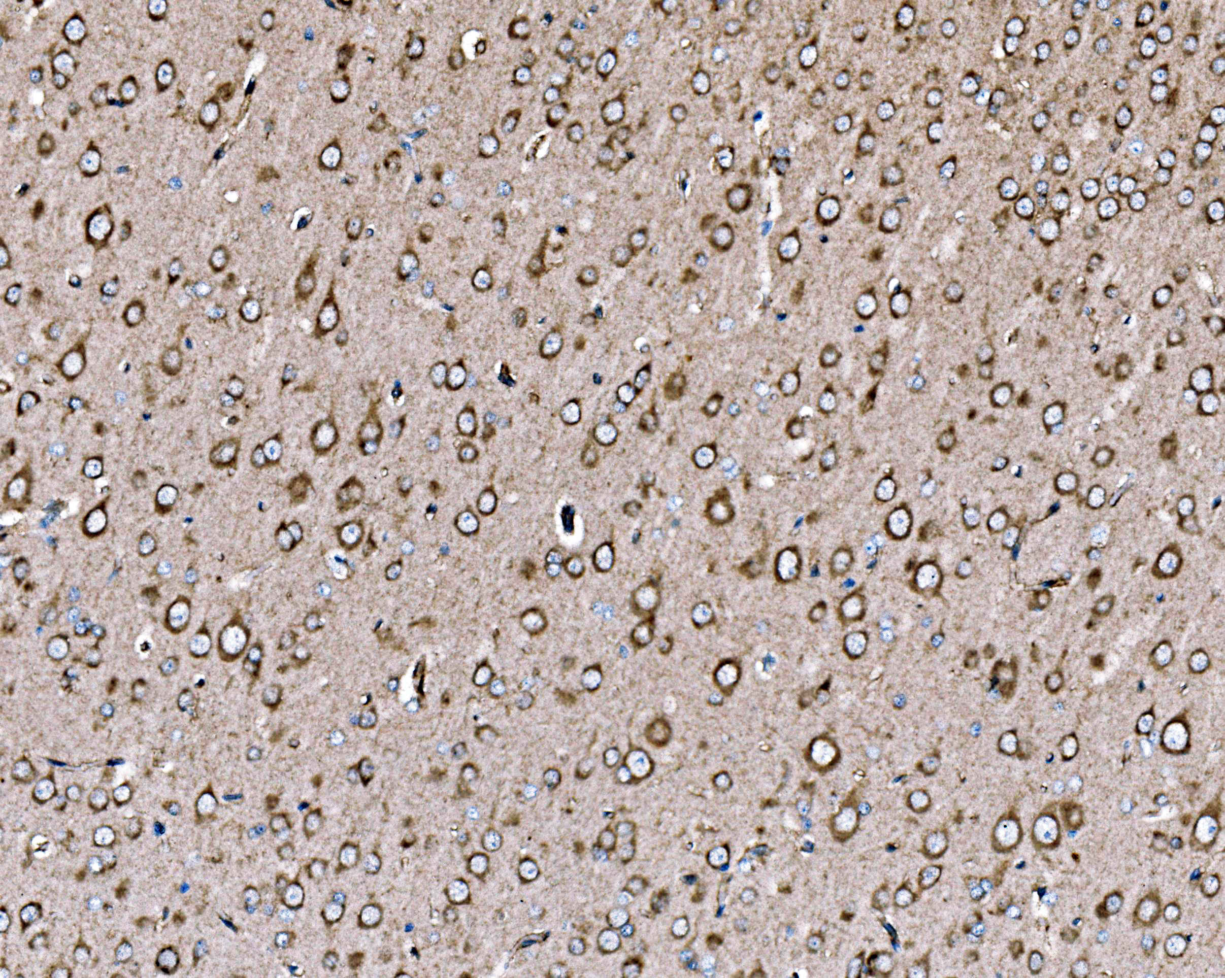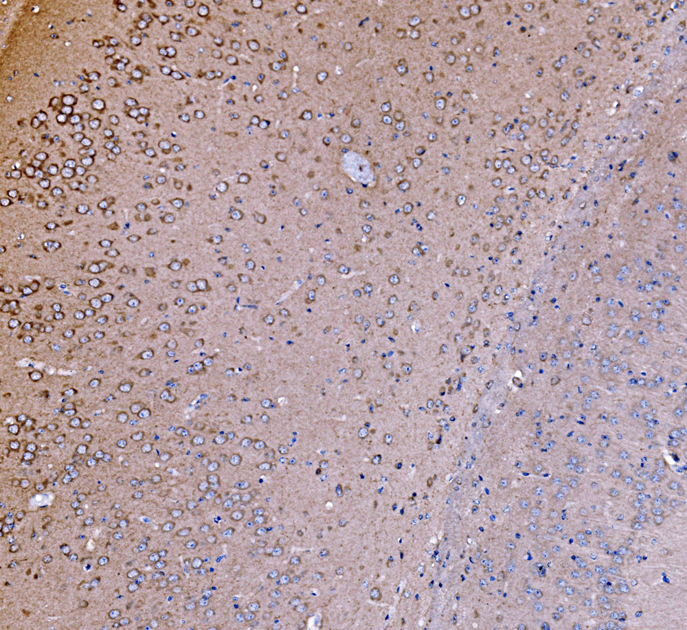 PI3K p85 alpha/PIK3R1 was detected in a paraffin-embedded section of mouse brain tissue. Biotinylated goat anti-rabbit IgG was used as secondary antibody. The tissue section was incubated with rabbit anti-PI3K p85 alpha/PIK3R1 Antibody (A00318-1) at a dilution of 1:200 and developed using Strepavidin-Biotin-Complex (SABC) (Catalog # SA1022) with DAB (Catalog # AR1027) as the chromogen.