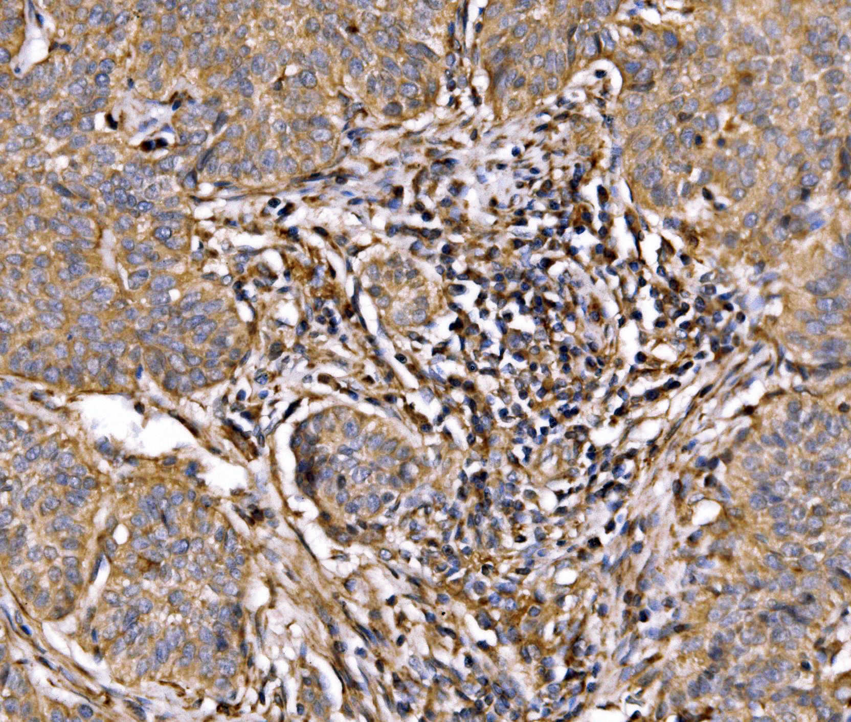 PI3K p85 alpha/PIK3R1 was detected in a paraffin-embedded section of human lung cancer tissue. Biotinylated goat anti-rabbit IgG was used as secondary antibody. The tissue section was incubated with rabbit anti-PI3K p85 alpha/PIK3R1 Antibody (A00318-1) at a dilution of 1:200 and developed using Strepavidin-Biotin-Complex (SABC) (Catalog # SA1022) with DAB (Catalog # AR1027) as the chromogen.