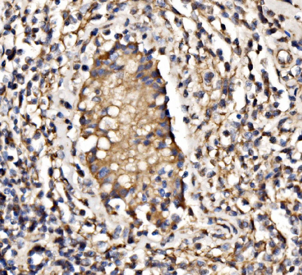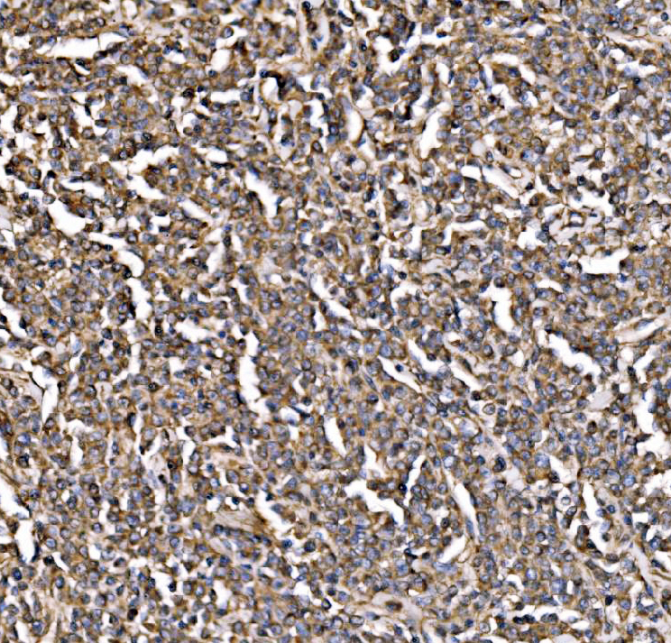 PI3K p85 alpha/PIK3R1 was detected in a paraffin-embedded section of human lymphoma tissue. Biotinylated goat anti-rabbit IgG was used as secondary antibody. The tissue section was incubated with rabbit anti-PI3K p85 alpha/PIK3R1 Antibody (A00318-1) at a dilution of 1:200 and developed using Strepavidin-Biotin-Complex (SABC) (Catalog # SA1022) with DAB (Catalog # AR1027) as the chromogen.