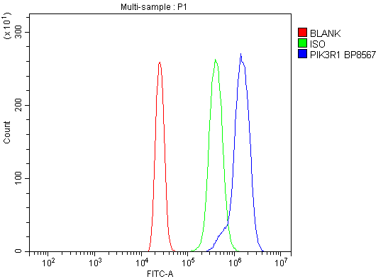 Overlay histogram showing HL-60 cells stained with A00318-1 (Blue line). To facilitate intracellular staining, cells were fixed with 4% paraformaldehyde and permeabilized with permeabilization buffer. The cells were blocked with 10% normal goat serum. And then incubated with rabbit anti-PI3K p85 alpha/PIK3R1 Antibody (A00318-1) at 1:100 dilution for 30 min at 20°C. DyLight®488 conjugated goat anti-rabbit IgG (BA1127) was used as secondary antibody at 1:100 dilution for 30 minutes at 20°C. Isotype control antibody (Green line) was rabbit IgG at 1:100 dilution used under the same conditions. Unlabelled sample without incubation with primary antibody and secondary antibody (Red line) was used as a blank control.