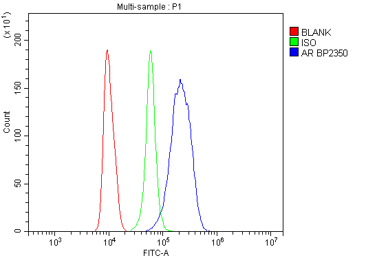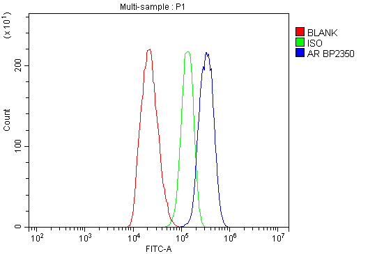 Overlay histogram showing A549 cells stained with A00542 (Blue line). To facilitate intracellular staining, cells were fixed with 4% paraformaldehyde and permeabilized with permeabilization buffer. The cells were blocked with 10% normal goat serum. And then incubated with rabbit anti-Androgen receptor/AR Antibody (A00542) at 1:100 dilution for 30 min at 20°C. DyLight®488 conjugated goat anti-rabbit IgG (BA1127) was used as secondary antibody at 1:100 dilution for 30 minutes at 20°C. Isotype control antibody (Green line) was rabbit IgG at 1:100 dilution used under the same conditions. Unlabelled sample without incubation with primary antibody and secondary antibody (Red line) was used as a blank control.
