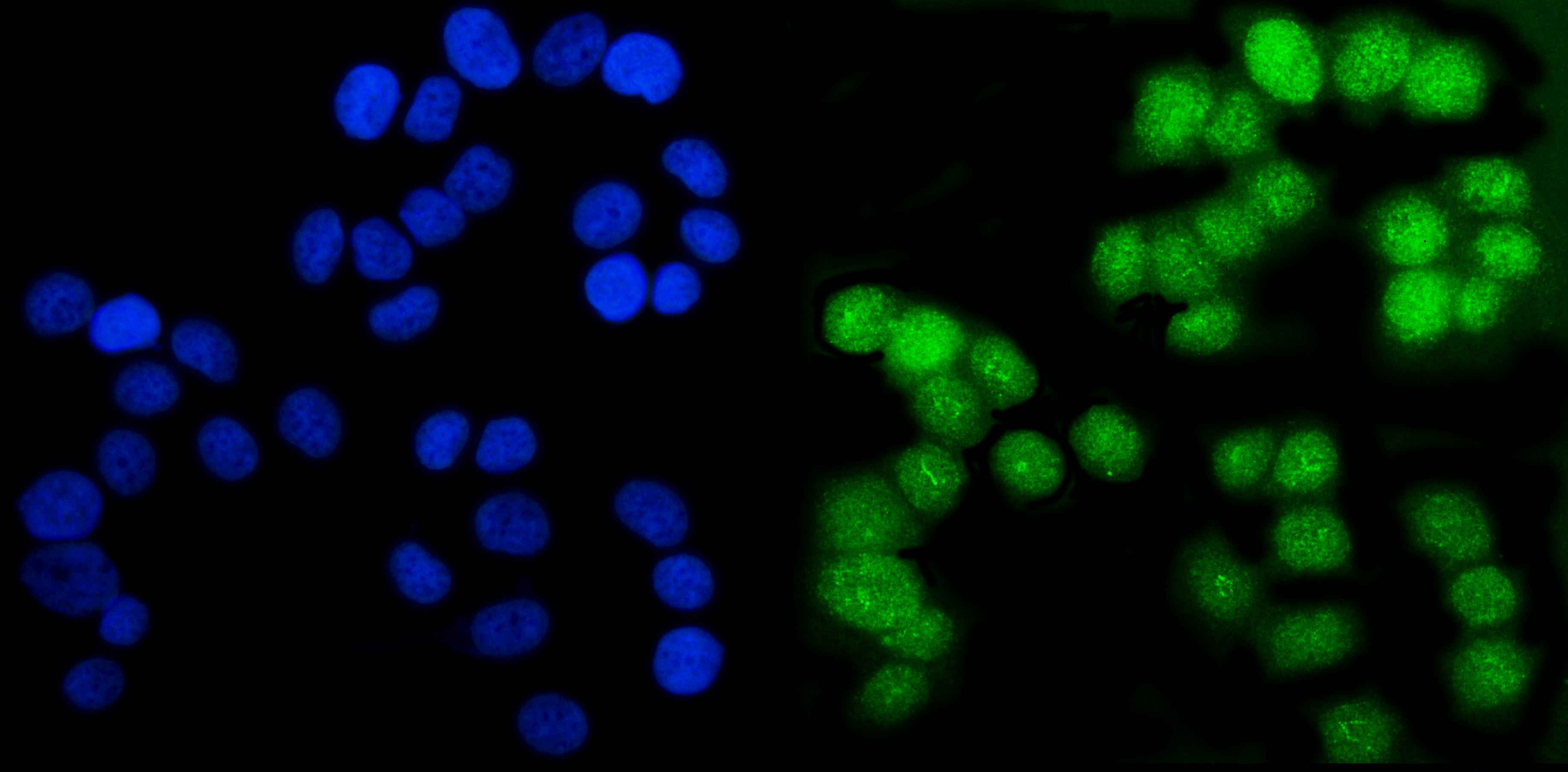 Androgen receptor/AR was detected in an immunocytochemical section of T-47D cells. The section was incubated with rabbit anti-Androgen receptor/AR Antibody (A00542) at a dilution of 1:100. DyLight®488 Conjugated Goat Anti-Rabbit IgG (Green) (Catalog # BA1127) was used as secondary antibody. The section was counterstained with DAPI (Catalog # AR1176) (Blue).