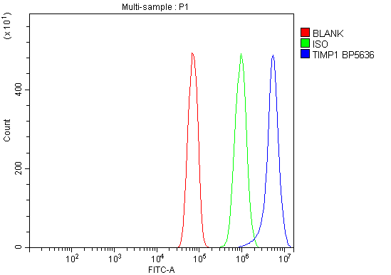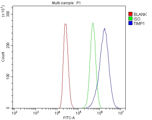 Overlay histogram showing RH-35 cells stained with A00561-2 (Blue line). The cells were fixed with 4% paraformaldehyde and blocked with 10% normal goat serum. And then incubated with rabbit anti-TIMP1 Antibody (A00561-2) at 1:100 dilution for 30 min at 20°C. DyLight®488 conjugated goat anti-rabbit IgG (BA1127) was used as secondary antibody at 1:100 dilution for 30 minutes at 20°C. Isotype control antibody (Green line) was rabbit IgG at 1:100 dilution used under the same conditions. Unlabelled sample without incubation with primary antibody and secondary antibody (Red line) was used as a blank control.