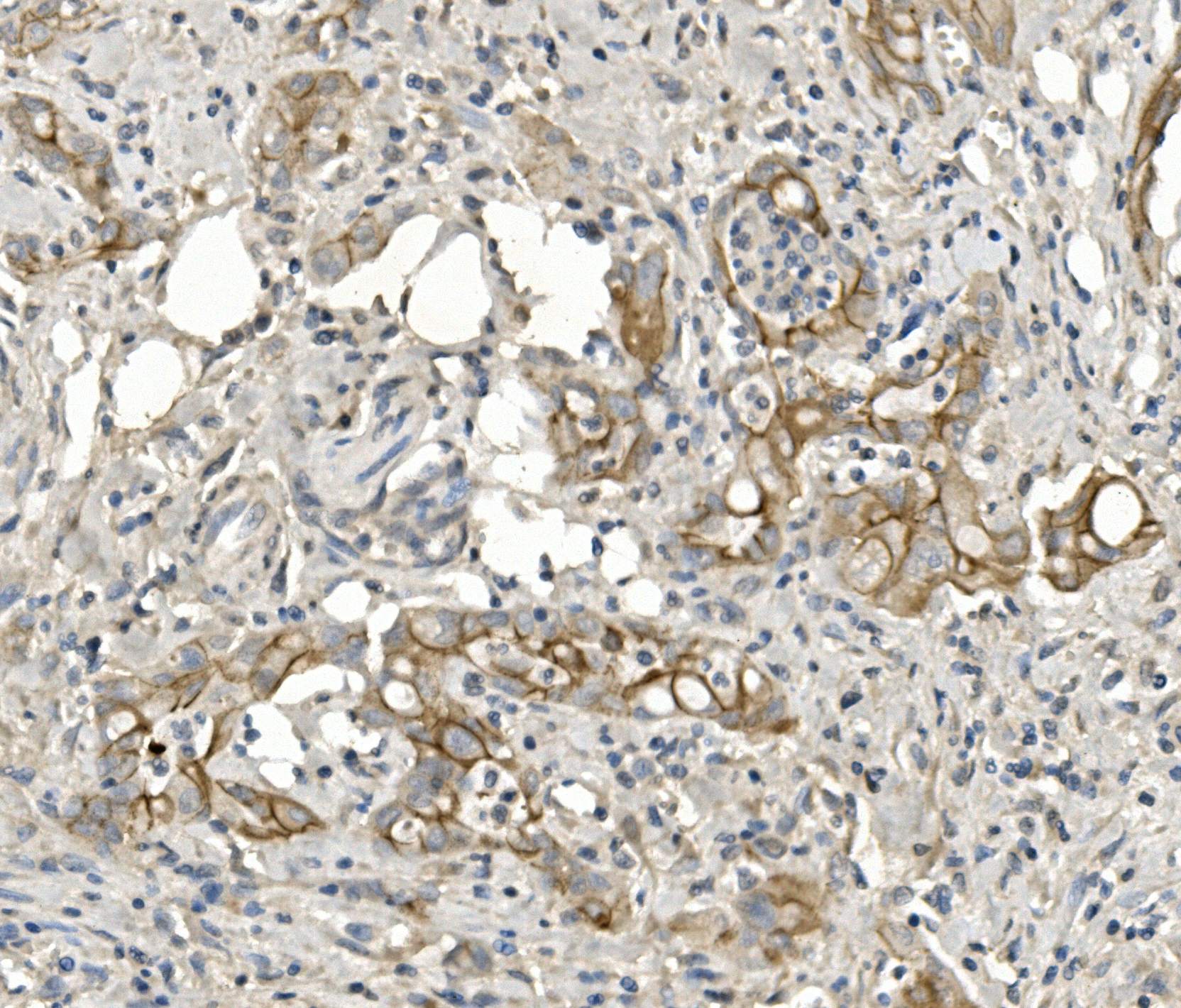 DSP was detected in paraffin-embedded section of human rectal cancer tissue. The tissue section was blocked with 10% goat serum. The tissue section was then incubated with 1μg/ml rabbit anti-DSP Antibody (A00616-1) overnight at 4°C. Biotinylated goat anti-rabbit IgG was used as secondary antibody and incubated for 30 minutes at 37°C. The tissue section was developed using Strepavidin-Biotin-Complex (SABC) (Catalog # SA1022) with DAB as the chromogen.