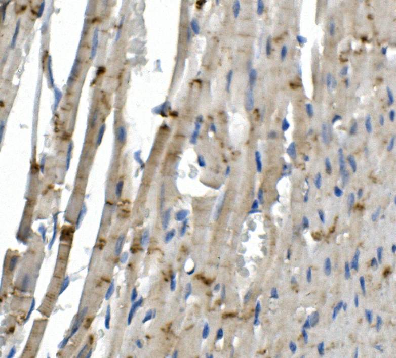 DSP was detected in paraffin-embedded section of mouse cardiac muscle tissue. The tissue section was blocked with 10% goat serum. The tissue section was then incubated with 1μg/ml rabbit anti-DSP Antibody (A00616-1) overnight at 4°C. Biotinylated goat anti-rabbit IgG was used as secondary antibody and incubated for 30 minutes at 37°C. The tissue section was developed using Strepavidin-Biotin-Complex (SABC) (Catalog # SA1022) with DAB as the chromogen.