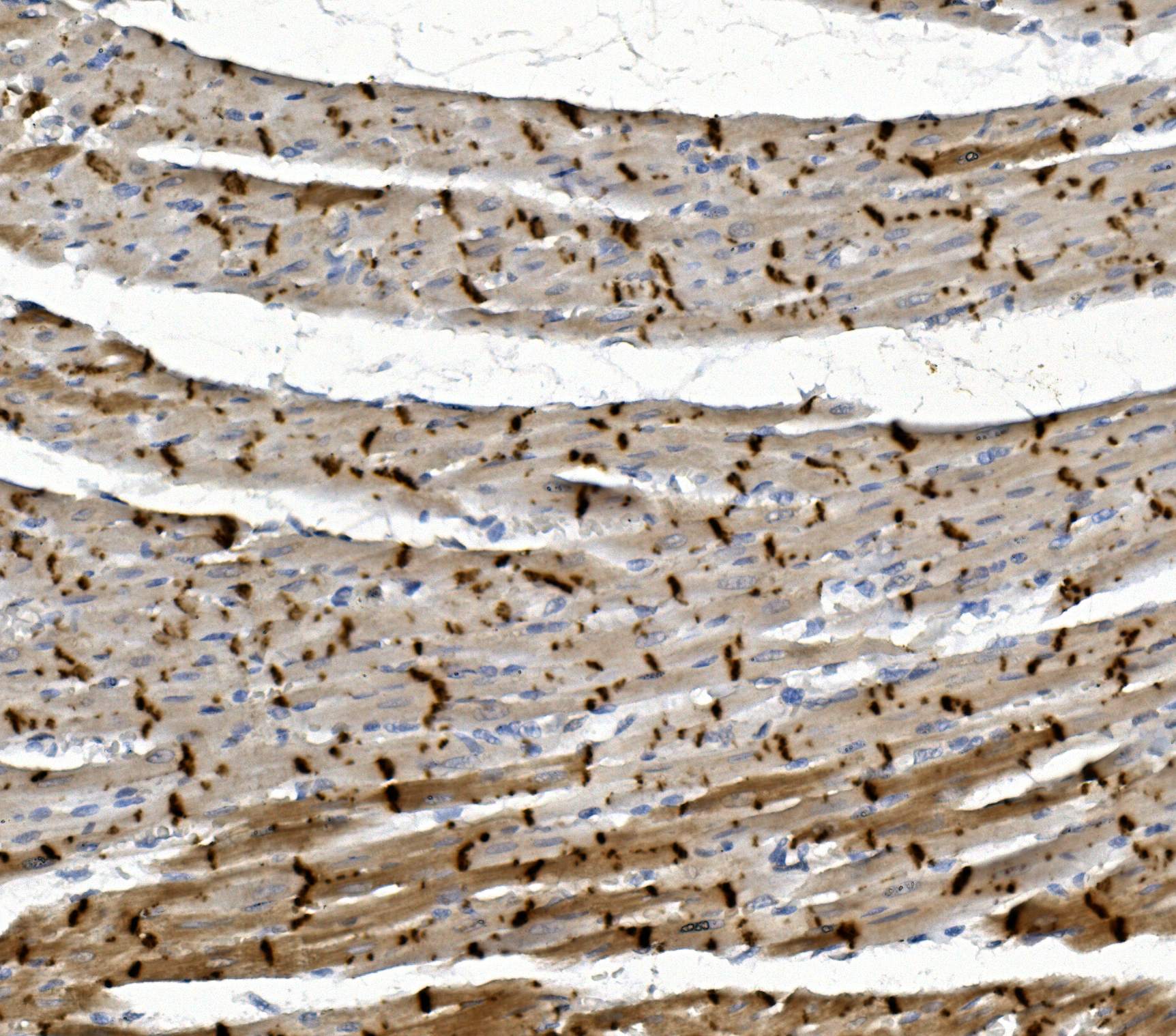 DSP was detected in paraffin-embedded section of rat cardiac muscle tissue. The tissue section was blocked with 10% goat serum. The tissue section was then incubated with 1μg/ml rabbit anti-DSP Antibody (A00616-1) overnight at 4°C. Biotinylated goat anti-rabbit IgG was used as secondary antibody and incubated for 30 minutes at 37°C. The tissue section was developed using Strepavidin-Biotin-Complex (SABC) (Catalog # SA1022) with DAB as the chromogen.