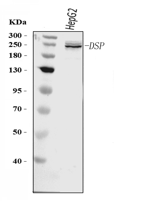 Figure 1. Western blot analysis of Desmoplakin using anti-Desmoplakin antibody (A00616-1). Lane 1: human HepG2 whole cell lysates. anti-Desmoplakin antigen affinity purified polyclonal antibody (Catalog # A00616-1)probed with a goat anti-rabbit IgG-HRP secondary antibody The signal is developed using an Enhanced Chemiluminescent detection (ECL) kit (Catalog # EK1002) . A specific band was detected for Desmoplakin at approximately 250-280KD. The expected band size for Desmoplakin is at 332KD.