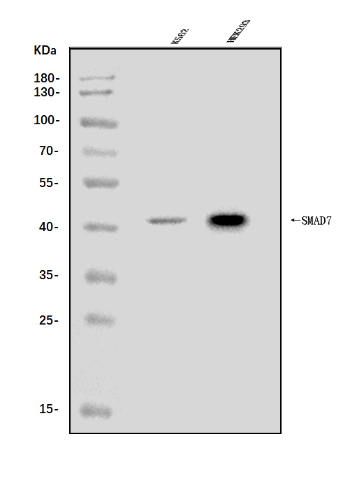 Western blot analysis of SMAD7 using anti-SMAD7 antibody (A00784-1). The sample well of each lane was loaded with 30 ug of sample under reducing conditions.