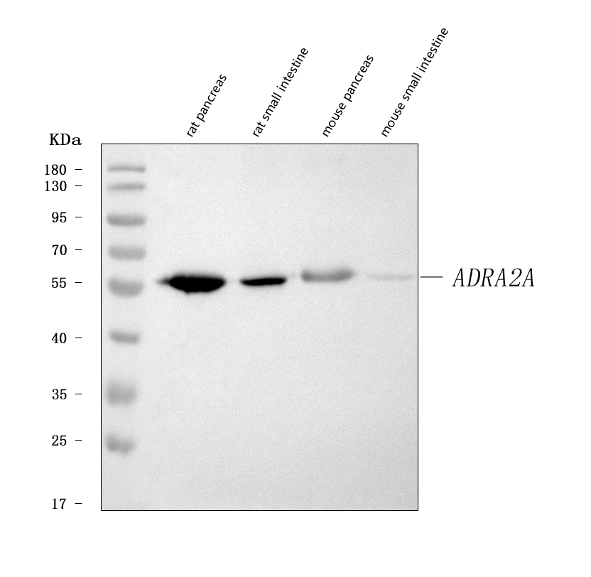 Use rabbit anti- ADRA2A 1:1000, probed with a goat anti-rabbit IgG-HRP secondary antibody. The signal is developed using an Enhanced Chemiluminescent detection (ECL) kit (Catalog # EK1002). A specific band was detected for ADRA2A at approximately 55KD. The expected band size for ADRA2A is at 49KD.