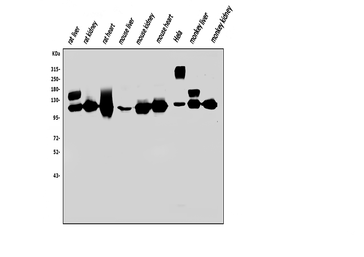 Figure 1. Western blot analysis of anti-NNT antibody (A00887-3). The sample well of each lane was loaded with 50ug of sample under reducing conditions.Lane 1: Rat liver tissue lysates,Lane 2: Rat kidney tissue lysates,Lane 3: Rat heart tissue lysates,Lane 4: Mouse liver tissue lysates,Lane 5: Mouse kidney tissue lysates,Lane 6: Mouse heart tissue lysates,Lane 7: human HELA whole cell lysates,Lane 8: Monkey liver tissue lysates,Lane 9: Monkey kidney tissue lysates,Use rabbit anti- NNT 1:1000, probed with a goat anti-rabbit IgG-HRP secondary antibody. The signal is developed using an Enhanced Chemiluminescent detection (ECL) kit (Catalog # EK1002). A specific band was detected for NNT at approximately 114KD. The expected band size for NNT is at 114KD.