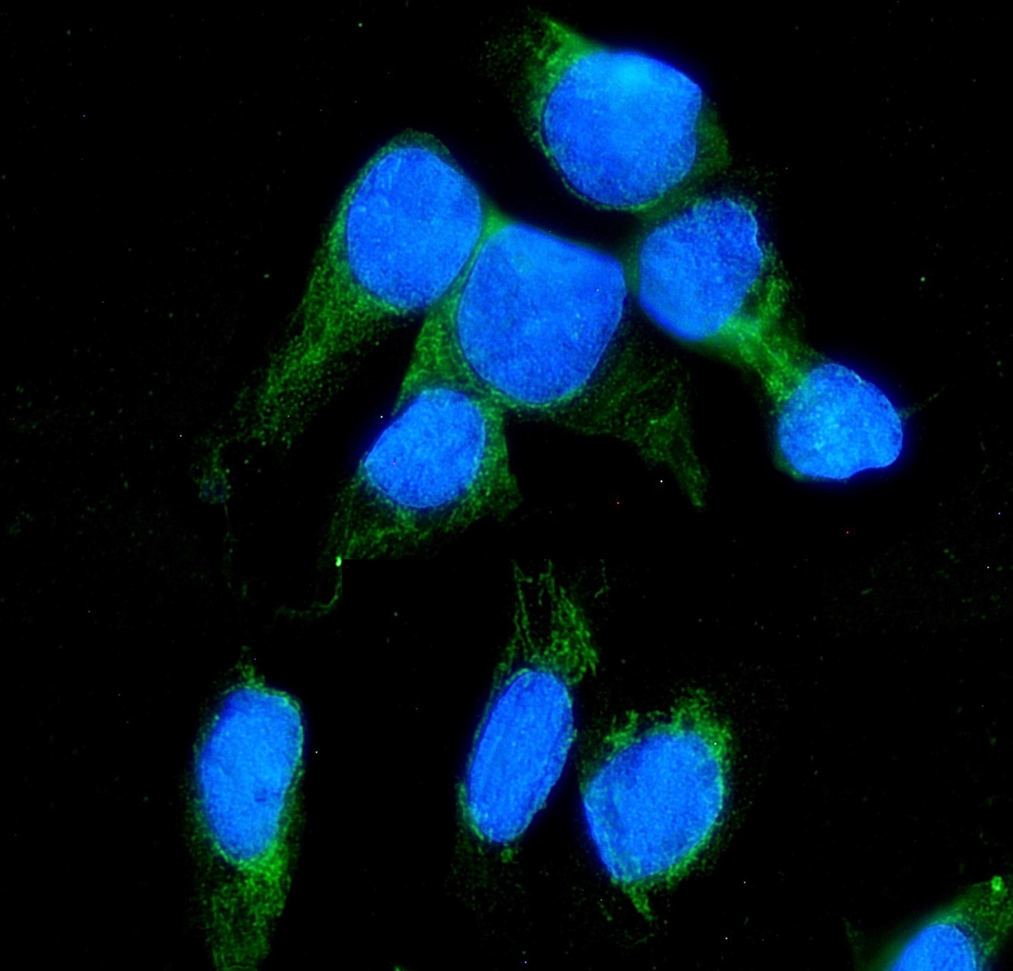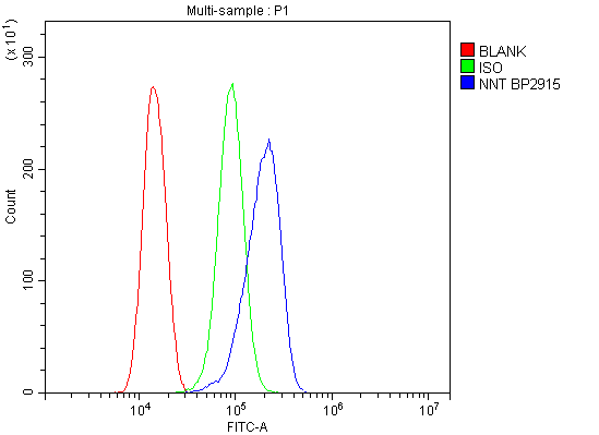 Figure 2. ICC analysis using anti-NNT antibody (A00887-3) was detected in immersion fixed U2OS cell line . Cells were stained using the Dylight488-conjugated Anti-rabbit IgG Secondary Antibody (green)(Catalog?#?BA1127) and counterstained with DAPI (blue).