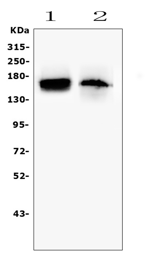 After electrophoresis, proteins were transferred to a membrane. Then the membrane was incubated with rabbit anti-TIE2/TEK antigen affinity purified polyclonal antibody (A01274-2) at a dilution of 1:1000 and probed with a goat anti-rabbit IgG-HRP secondary antibody (Catalog # BA1054). The signal is developed using ECL Plus Western Blotting Substrate (Catalog # AR1197). A specific band was detected for TIE2/TEK at approximately 160 kDa. The expected band size for TIE2/TEK is at 126 kDa.