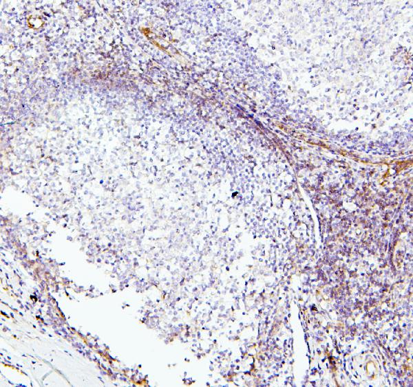 TIE2/TEK was detected in a paraffin-embedded section of human tonsil tissue. Biotinylated goat anti-rabbit IgG was used as secondary antibody. The tissue section was incubated with rabbit anti-TIE2/TEK Antibody (A01274-2) at a dilution of 1:200 and developed using Strepavidin-Biotin-Complex (SABC) (Catalog # SA1022) with DAB (Catalog # AR1027) as the chromogen.