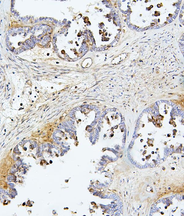 TIE2/TEK was detected in a paraffin-embedded section of human ovarian cancer tissue. Biotinylated goat anti-rabbit IgG was used as secondary antibody. The tissue section was incubated with rabbit anti-TIE2/TEK Antibody (A01274-2) at a dilution of 1:200 and developed using Strepavidin-Biotin-Complex (SABC) (Catalog # SA1022) with DAB (Catalog # AR1027) as the chromogen.