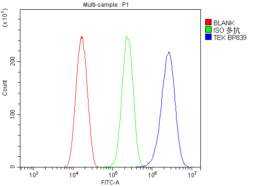 Overlay histogram showing Hela cells stained with A01274-2 (Blue line). To facilitate intracellular staining, cells were fixed with 4% paraformaldehyde and permeabilized with permeabilization buffer. The cells were blocked with 10% normal goat serum. And then incubated with rabbit anti-TIE2/TEK Antibody (A01274-2) at 1:100 dilution for 30 min at 20°C. DyLight®488 conjugated goat anti-rabbit IgG (BA1127) was used as secondary antibody at 1:100 dilution for 30 minutes at 20°C. Isotype control antibody (Green line) was rabbit IgG at 1:100 dilution used under the same conditions. Unlabelled sample without incubation with primary antibody and secondary antibody (Red line) was used as a blank control.