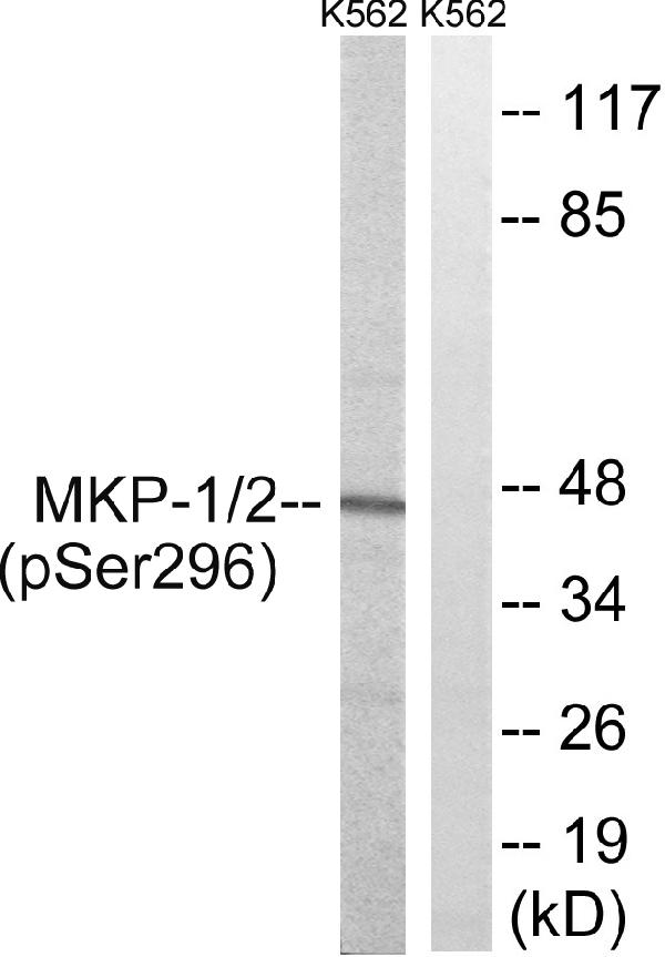 Western blot analysis of lysates from Jurkat cells, using MKP-1/2 Antibody. The lane on the right is blocked with the synthesized peptide.