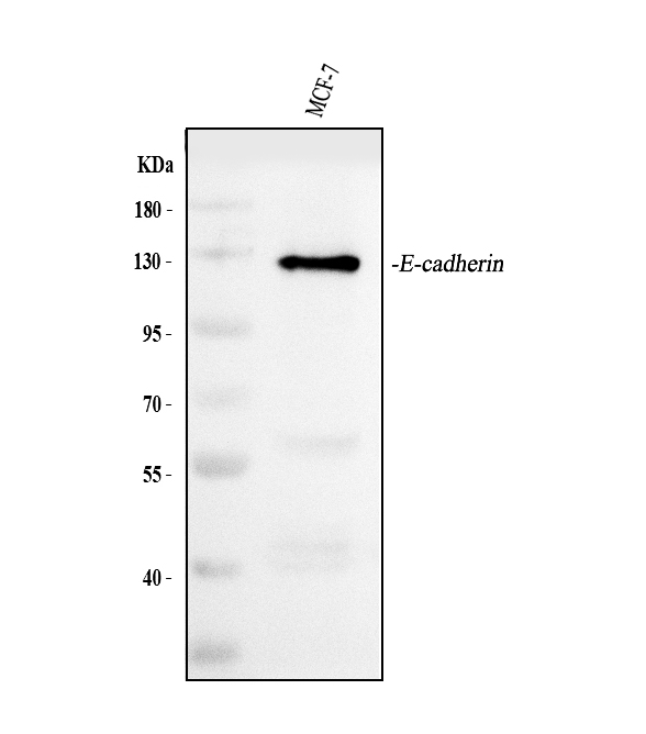 Western blot analysis of E-cadherin/CDH1 using anti-E-cadherin/CDH1 antibody (BA0475). The sample well of each lane was loaded with 30 ug of sample under reducing conditions.