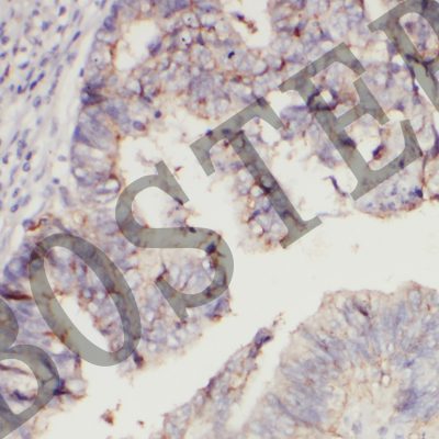 GJA5 was detected in a paraffin-embedded section of human intestinal cancer tissue. Biotinylated goat anti-rabbit IgG was used as secondary antibody. The tissue section was incubated with rabbit anti-GJA5 Antibody (BA1593) at a dilution of 1:200 and developed using Strepavidin-Biotin-Complex (SABC) (Catalog # SA1022) with DAB (Catalog # AR1027) as the chromogen.