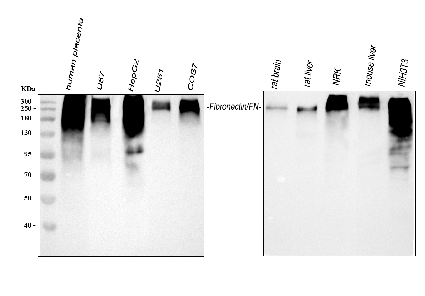 Western blot analysis of anti-Fibronectin(FN1) antibody (BA1772). The sample well of each lane was loaded with 30 ug of sample under reducing conditions.