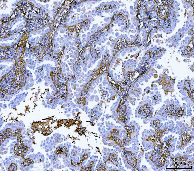 IHC analysis of Fibronectin(FN1) using anti-Fibronectin(FN1) antibody (BA1772). Fibronectin(FN1) was detected in a paraffin-embedded section of human lung cancer tissue. Biotinylated goat anti-rabbit IgG was used as secondary antibody. The tissue section was developed using Strepavidin-Biotin-Complex (SABC) (Catalog # SA1022) with DAB (Catalog # AR1027) as the chromogen.