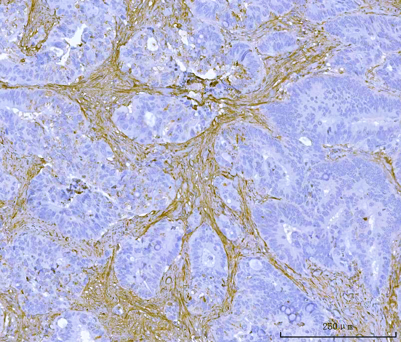 IHC analysis of Fibronectin(FN1) using anti-Fibronectin(FN1) antibody (BA1772). Fibronectin(FN1) was detected in a paraffin-embedded section of human rectal cancer tissue. Biotinylated goat anti-rabbit IgG was used as secondary antibody. The tissue section was developed using Strepavidin-Biotin-Complex (SABC) (Catalog # SA1022) with DAB (Catalog # AR1027) as the chromogen.