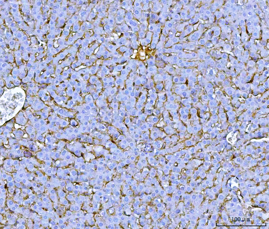 IHC analysis of Fibronectin(FN1) using anti-Fibronectin(FN1) antibody (BA1772). Fibronectin(FN1) was detected in a paraffin-embedded section of rat liver tissue. Biotinylated goat anti-rabbit IgG was used as secondary antibody. The tissue section was developed using Strepavidin-Biotin-Complex (SABC) (Catalog # SA1022) with DAB (Catalog # AR1027) as the chromogen.