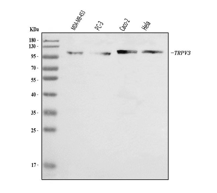 Western blot analysis of TRPV3 using anti-TRPV3 antibody (BA2875-2). The sample well of each lane was loaded with 30 ug of sample under reducing conditions.