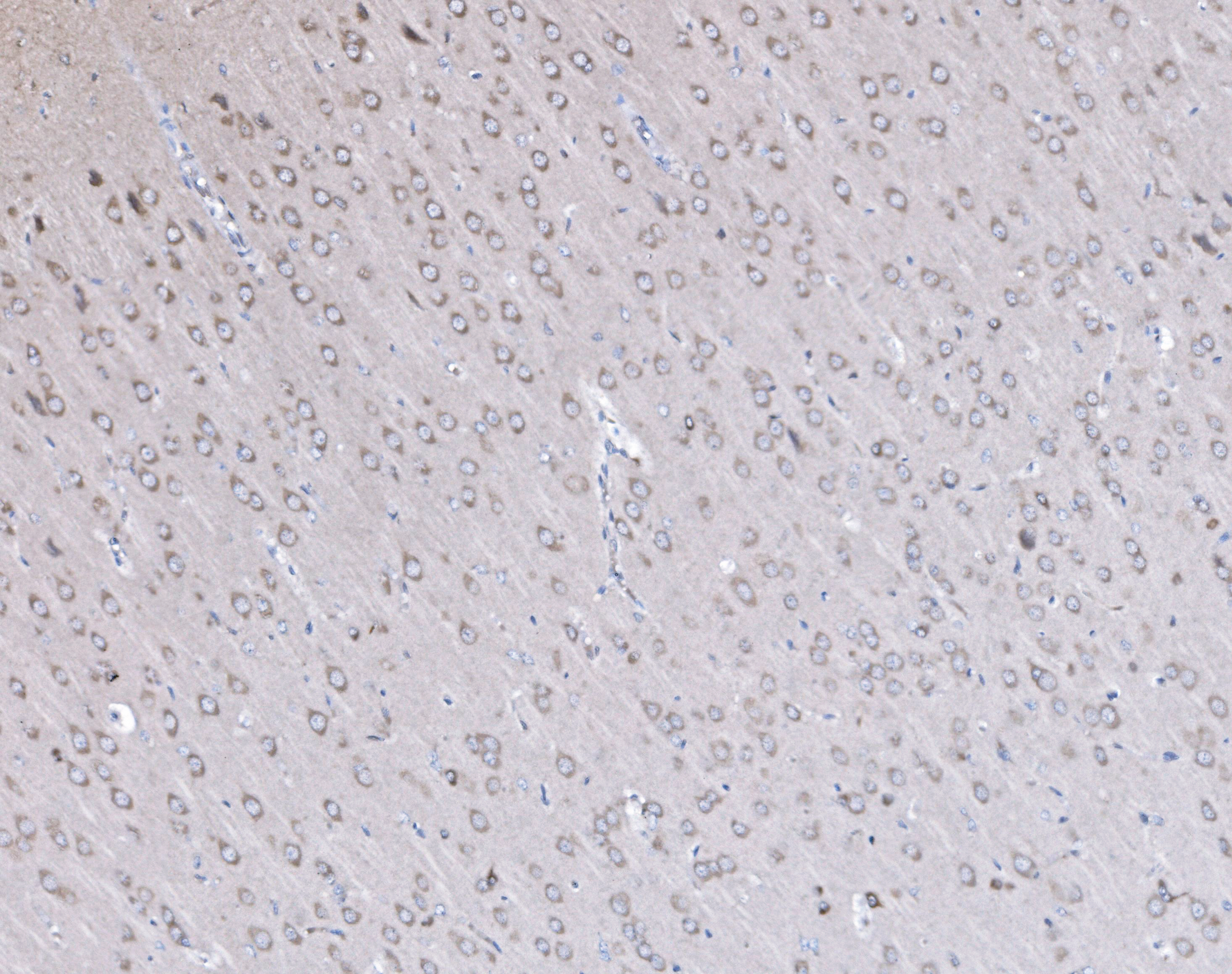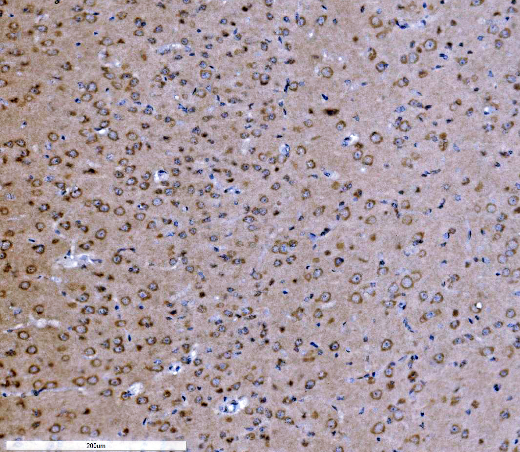 PSD95/DLG4 was detected in a paraffin-embedded section of rat brain tissue. The tissue section was incubated with rabbit anti-PSD95/DLG4 Antibody (BA3304) at a dilution of 1:200 and developed using HRP Conjugated Rabbit IgG Super Vision Assay Kit (Catalog # SV0002) with DAB (Catalog # AR1027) as the chromogen.