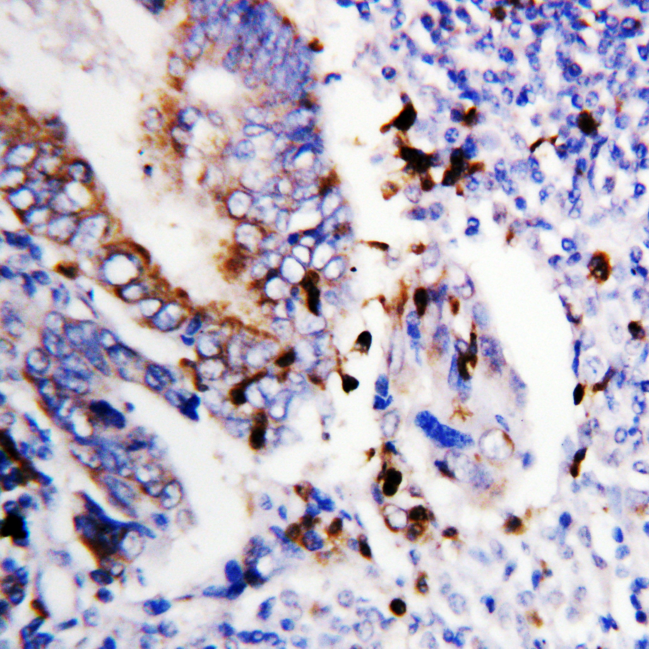 Bcl-XS/BCL2L1 was detected in a paraffin-embedded section of human colon cancer tissue. Biotinylated goat anti-rabbit IgG was used as secondary antibody. The tissue section was incubated with rabbit anti-Bcl-XS/BCL2L1 Antibody (BA3368) at a dilution of 1:200 and developed using Strepavidin-Biotin-Complex (SABC) (Catalog # SA1022) with DAB (Catalog # AR1027) as the chromogen.
