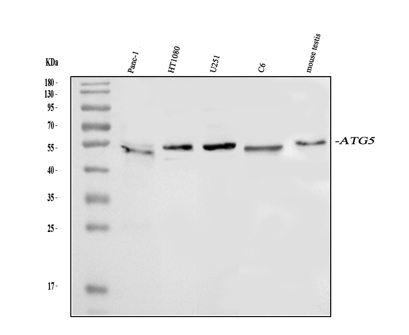 Western blot analysis of ATG5 using anti-ATG5 antibody (BA3525-2). The sample well of each lane was loaded with 30 ug of sample under reducing conditions.