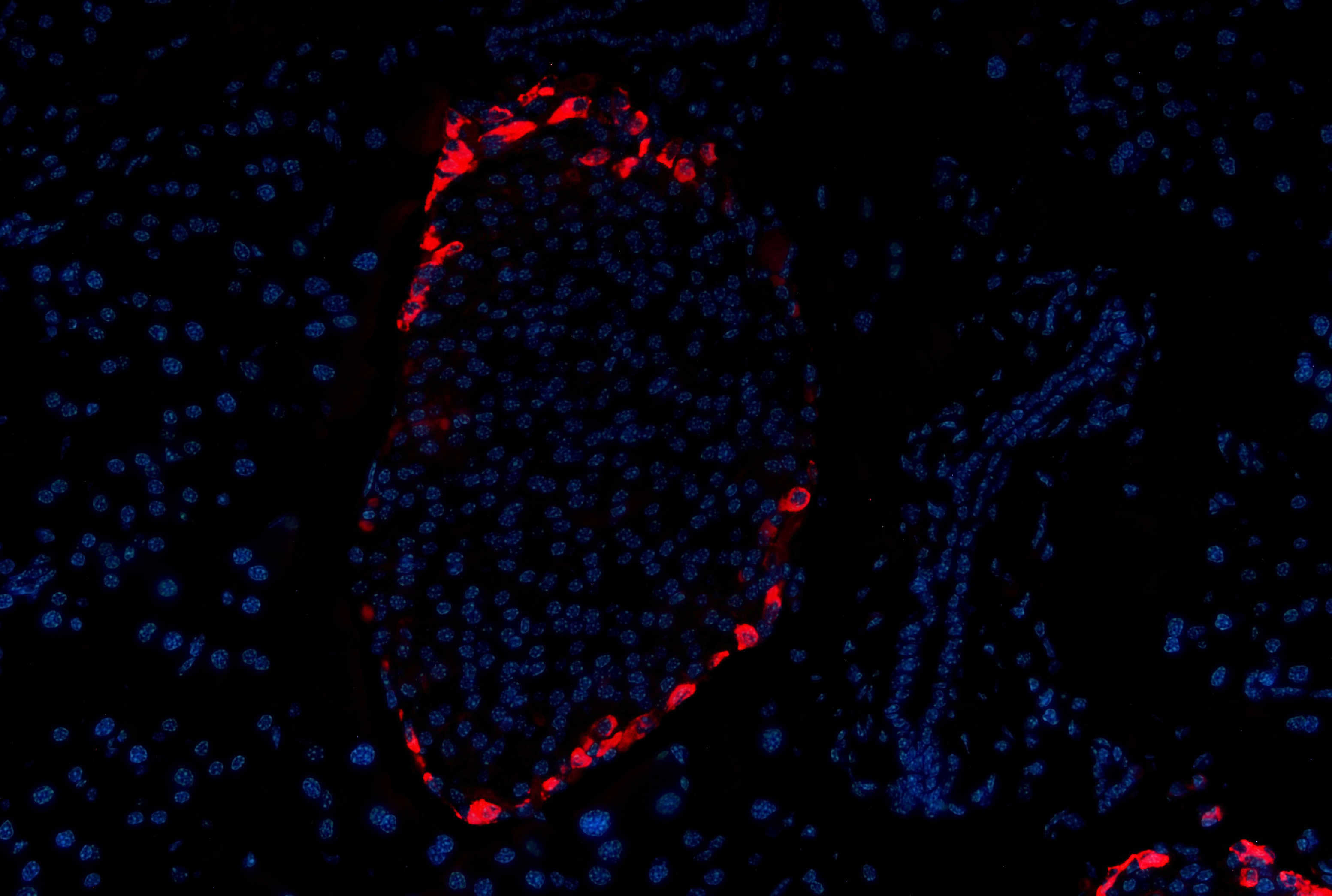 Glucagon/GCG was detected in a paraffin-embedded section of mouse pancreas tissue. The tissue section was incubated with mouse anti-Glucagon/GCG Antibody (BM1621) at a dilution of 1:100. Dylight594-conjugated Anti-mouse IgG Secondary Antibody (red) (Catalog # BA1141) was used as secondary antibody. The section was counterstained with DAPI (Catalog # AR1176) (Blue).