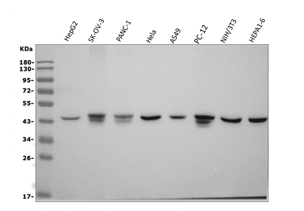 Western blot analysis of anti-Actin antibody (BM3872). The sample well of each lane was loaded with 30 ug of sample under reducing conditions.