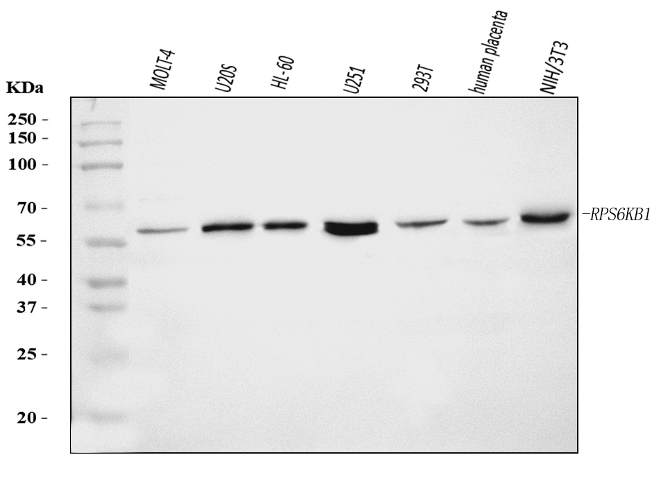 Western blot analysis of anti-p70 S6K/RPS6KB1 (Phospho-T421+S424) antibody (BM4141). The sample well of each lane was loaded with 30 ug of sample under reducing conditions.