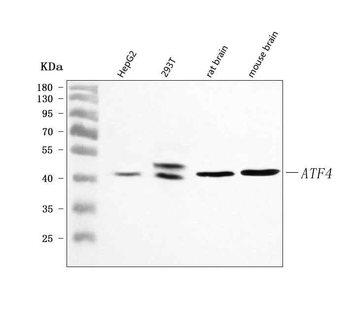Western blot analysis of ATF4 expression in (1) HeLa cell lysate; (2) 3T3 cell lysate.