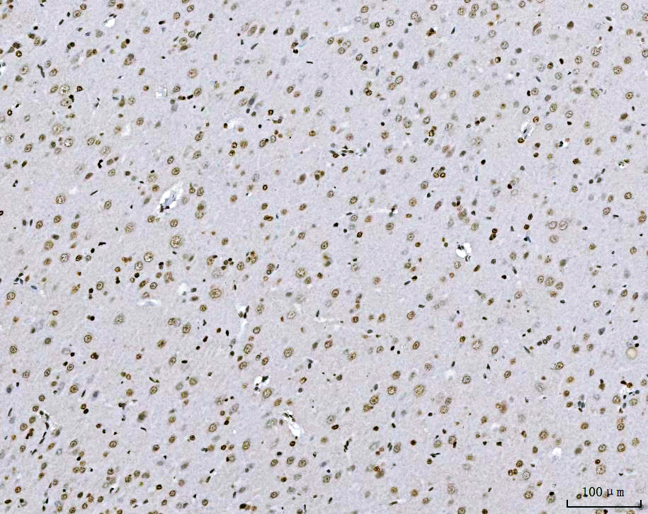 ZEB1 was detected in a paraffin-embedded section of mouse brain tissue. Biotinylated goat anti-mouse IgG was used as secondary antibody. The tissue section was incubated with mouse anti-ZEB1 Antibody (M00548-2) at a dilution of 1:200 and developed using Strepavidin-Biotin-Complex (SABC) (Catalog # SA1021) with DAB (Catalog # AR1027) as the chromogen.