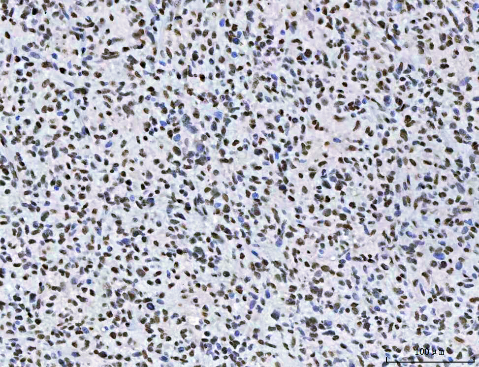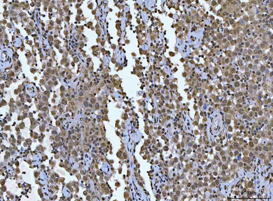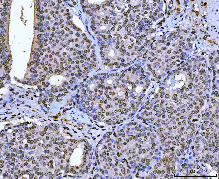 | (Boiling the paraffin sections in 10mM citrate buffer,pH6.0,or PH8.0 EDTA repair liquid for 20 mins is required for the staining of formalin/paraffin sections.) Optimal working dilutions must be determined by end user. | |