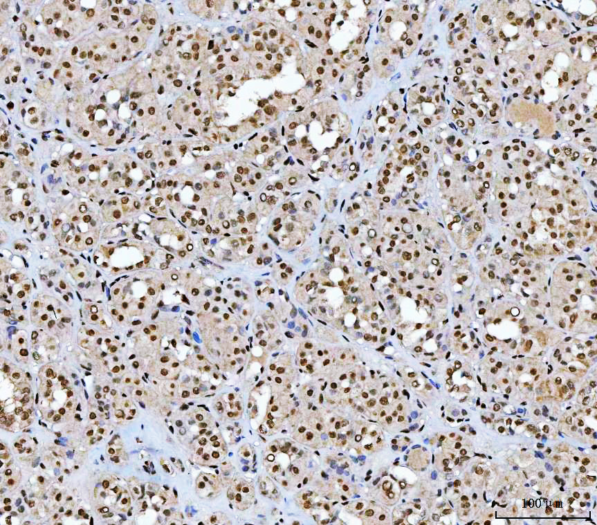ZEB1 was detected in a paraffin-embedded section of human thyroid cancer tissue. Biotinylated goat anti-mouse IgG was used as secondary antibody. The tissue section was incubated with mouse anti-ZEB1 Antibody (M00548-2) at a dilution of 1:200 and developed using Strepavidin-Biotin-Complex (SABC) (Catalog # SA1021) with DAB (Catalog # AR1027) as the chromogen.