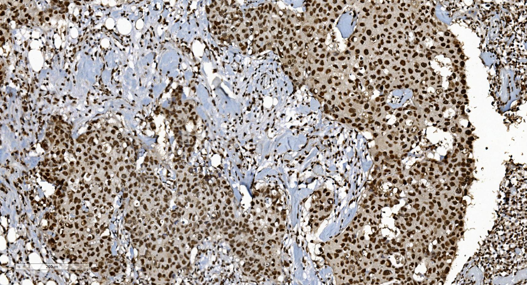 KU70/XRCC6 was detected in a paraffin-embedded section of human breast cancer tissue. Biotinylated goat anti-mouse IgG was used as secondary antibody. The tissue section was incubated with mouse anti-KU70/XRCC6 Antibody (M01732-3) at a dilution of 1:200 and developed using Strepavidin-Biotin-Complex (SABC) (Catalog # SA1021) with DAB (Catalog # AR1027) as the chromogen.