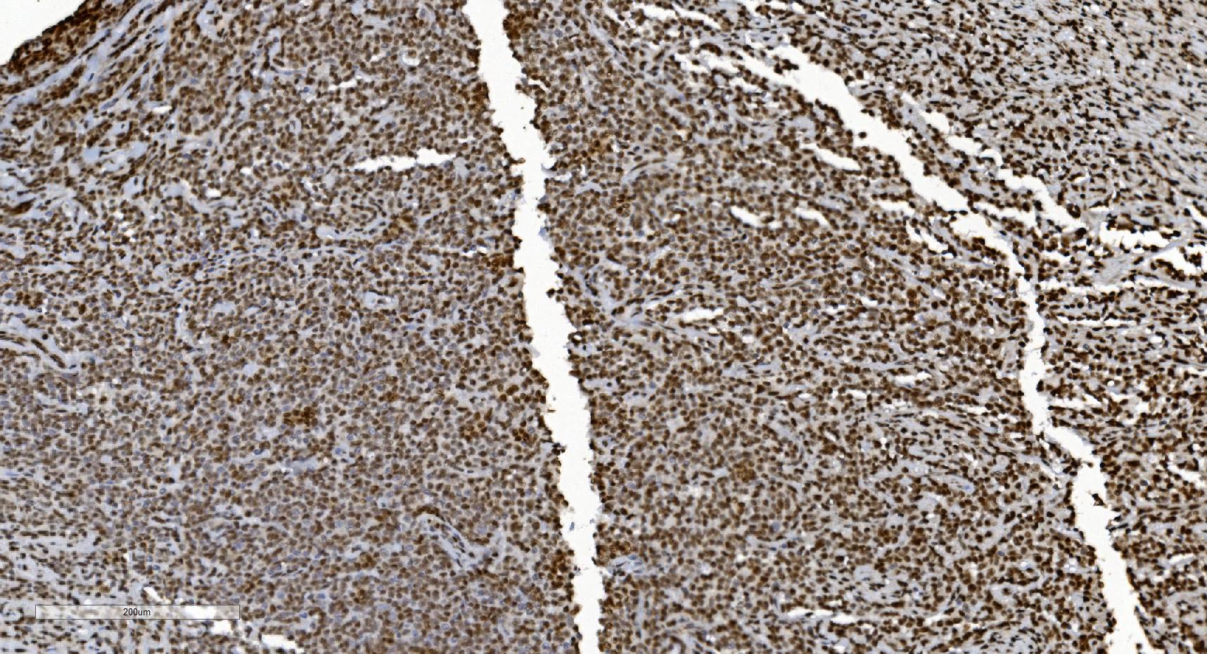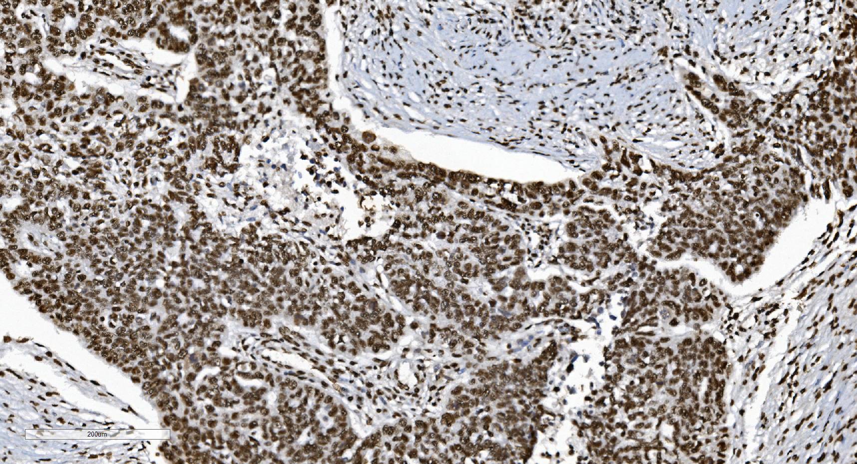 KU70/XRCC6 was detected in a paraffin-embedded section of human ovarian serous adenocarcinoma tissue. Biotinylated goat anti-mouse IgG was used as secondary antibody. The tissue section was incubated with mouse anti-KU70/XRCC6 Antibody (M01732-3) at a dilution of 1:200 and developed using Strepavidin-Biotin-Complex (SABC) (Catalog # SA1021) with DAB (Catalog # AR1027) as the chromogen.