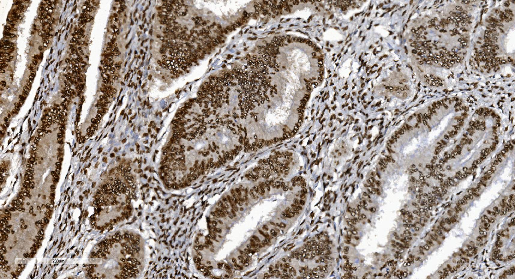 KU70/XRCC6 was detected in a paraffin-embedded section of human rectal cancer tissue. Biotinylated goat anti-mouse IgG was used as secondary antibody. The tissue section was incubated with mouse anti-KU70/XRCC6 Antibody (M01732-3) at a dilution of 1:200 and developed using Strepavidin-Biotin-Complex (SABC) (Catalog # SA1021) with DAB (Catalog # AR1027) as the chromogen.