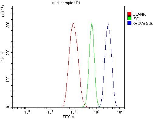 Overlay histogram showing THP-1 cells stained with M01732-3 (Blue line). To facilitate intracellular staining, cells were fixed with 4% paraformaldehyde and permeabilized with permeabilization buffer. The cells were blocked with 10% normal goat serum. And then incubated with mouse anti-KU70/XRCC6 Antibody (M01732-3) at 1:100 dilution for 30 min at 20°C. DyLight®488 conjugated goat anti-mouse IgG (BA1126) was used as secondary antibody at 1:100 dilution for 30 minutes at 20°C. Isotype control antibody (Green line) was mouse IgG at 1:100 dilution used under the same conditions. Unlabelled sample without incubation with primary antibody and secondary antibody (Red line) was used as a blank control.