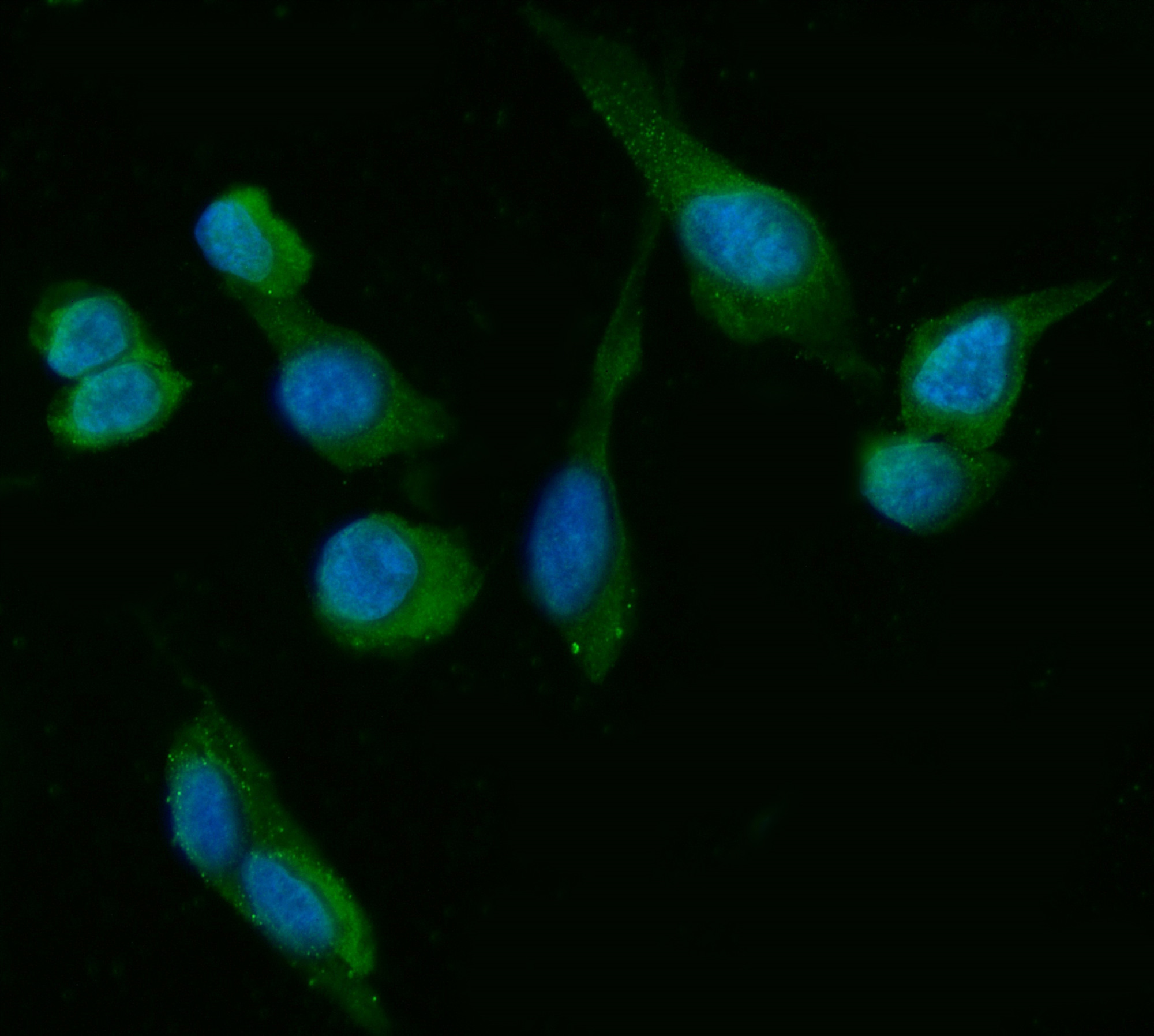 Figure 2. ICC analysis using anti- HSD3B1/B2 Antibody (M02856). was detected in immersion fixed U20S cell. Cells were stained using the Dylight488-conjugated Anti-mouse IgG Secondary Antibody (green)(Catalog # BA1126) and counterstained with DAPI (blue).