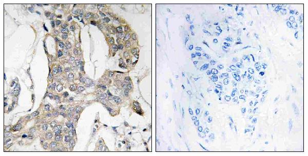 Immunohistochemistry analysis of paraffin-embedded human breast carcinoma, using MKP-1/2 (Phospho-Ser296/318) Antibody. The picture on the right is blocked with the phospho peptide.