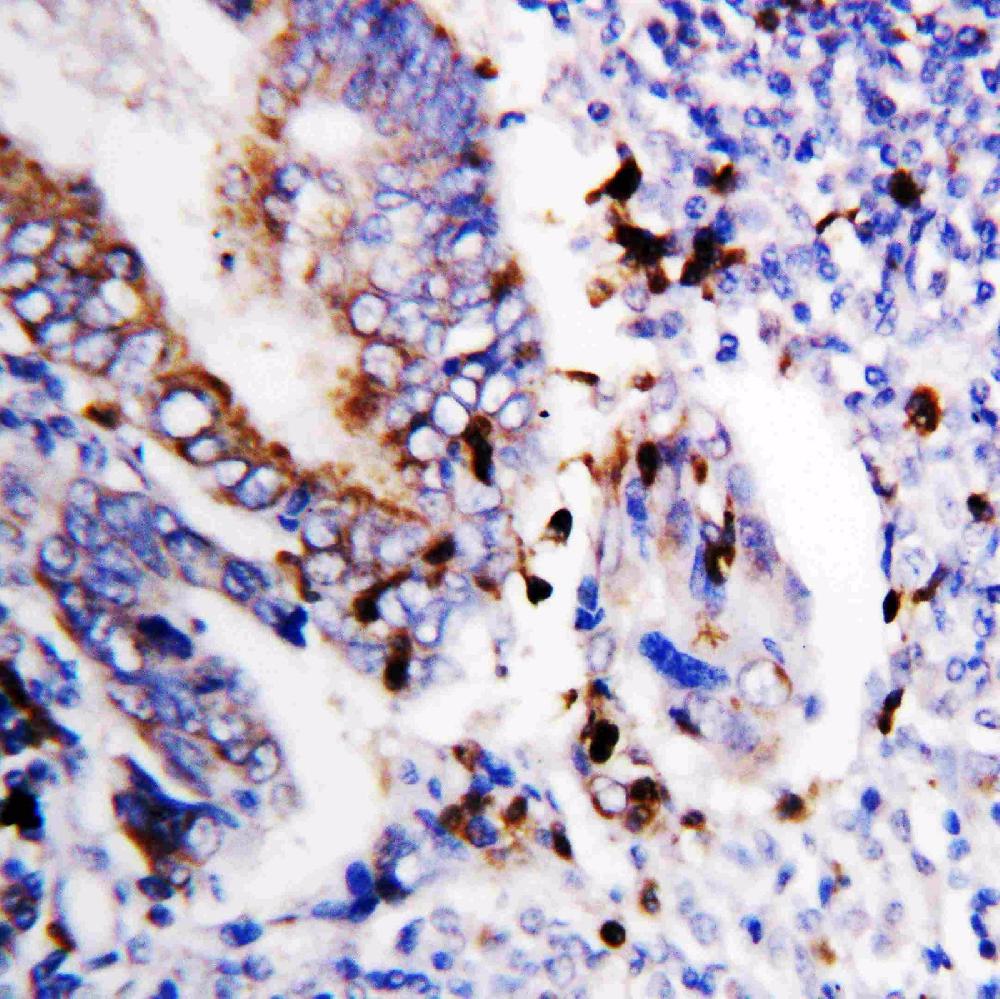 Bcl-XS/BCL2L1 was detected in a paraffin-embedded section of human colon cancer tissue. The tissue section was incubated with rabbit anti-Bcl-XS/BCL2L1 Antibody (PA1232) at a dilution of 1:200 and developed using HRP Conjugated Rabbit IgG Super Vision Assay Kit (Catalog # SV0002) with DAB (Catalog # AR1027) as the chromogen.