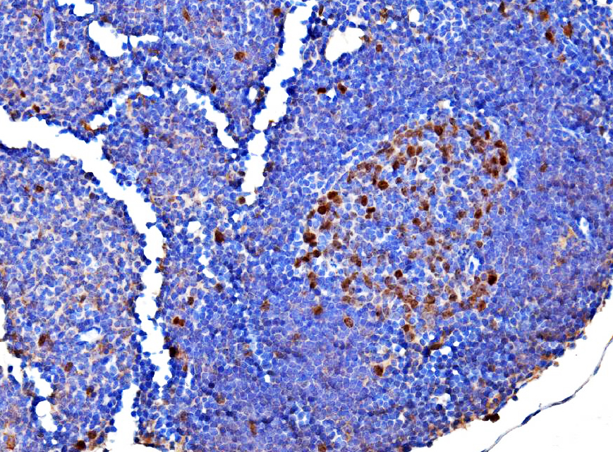 Survivin/BIRC5 was detected in a paraffin-embedded section of mouse lymph node tissue. Biotinylated goat anti-rabbit IgG was used as secondary antibody. The tissue section was incubated with rabbit anti-Survivin/BIRC5 Antibody (PB0377) at a dilution of 1:200 and developed using Strepavidin-Biotin-Complex (SABC) (Catalog # SA1022) with DAB (Catalog # AR1027) as the chromogen.