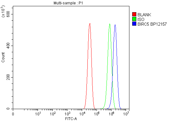 Overlay histogram showing Neuro-2a cells stained with PB0377 (Blue line). To facilitate intracellular staining, cells were fixed with 4% paraformaldehyde and permeabilized with permeabilization buffer. The cells were blocked with 10% normal goat serum. And then incubated with rabbit anti-Survivin/BIRC5 Antibody (PB0377) at 1:100 dilution for 30 min at 20°C. DyLight®488 conjugated goat anti-rabbit IgG (BA1127) was used as secondary antibody at 1:100 dilution for 30 minutes at 20°C. Isotype control antibody (Green line) was rabbit IgG at 1:100 dilution used under the same conditions. Unlabelled sample without incubation with primary antibody and secondary antibody (Red line) was used as a blank control.