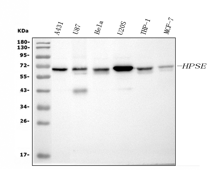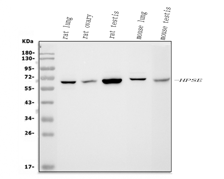 Western blot analysis of HPSE using anti-HPSE antibody (PB0405). The sample well of each lane was loaded with 30 ug of sample under reducing conditions.